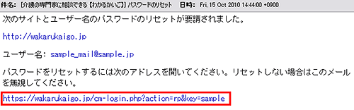 【[介護の専門家に相談できる 【わかるかいご】]パスワードのリセット】と書かれたメールが送られますので、メール本文中のアドレスをクリックしてください。